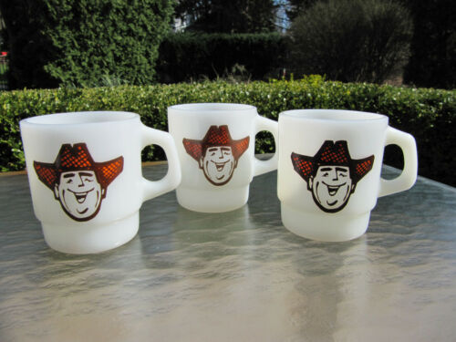(3) Anchor Hocking Milk Glass Vintage Farmer Jack Grocery Store Coffee Mugs