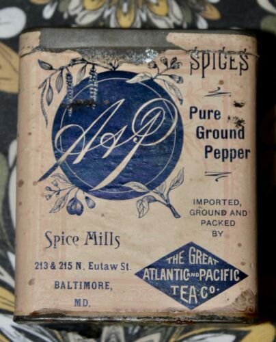 Title (ebay affiliate link): ANTIQUE C1900 A&P Spice Tin PEPPER Paper Label GREAT ATLANTIC & PACIFIC TEA CO