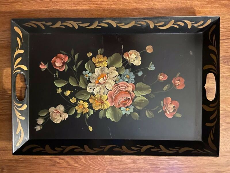 Title (ebay affiliate link): 2 Large Vintage/Antique Serving Trays-Metal Black Floral Tole & Wood With Fruit
