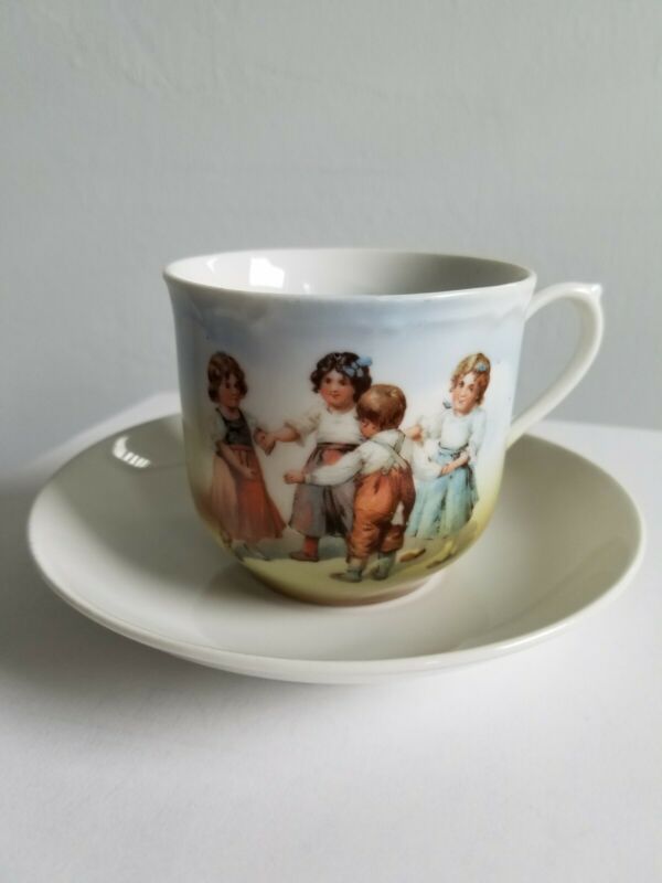 Vintage Antique Porcelain Cup And Saucer Set with Children Playing made Germany