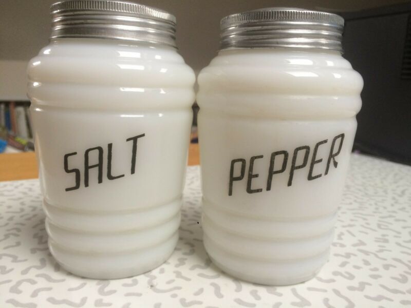 Title (ebay affiliate link): Vintage Hazel Atlas Milk Glass Black Letters beehive Ribbed Salt/Pepper shakers