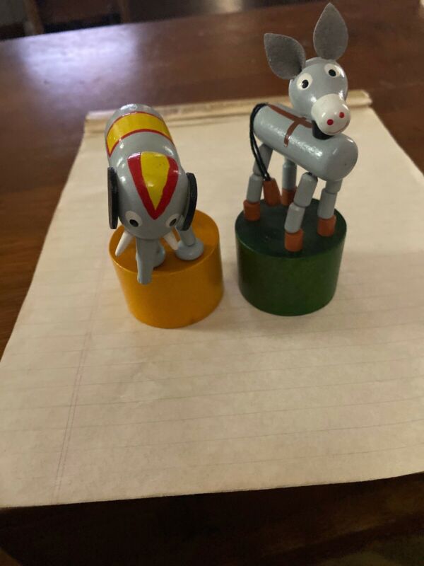 Title (ebay affiliate link): 2 Vintage Wooden Animals Push Puppet Thumb Toy Collapse Donkey and Elephant