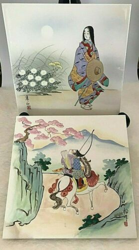 Vintage Hand Painted Porcelain 6"x 6" Oriental Warrior Geisha Japan (2) Tiles