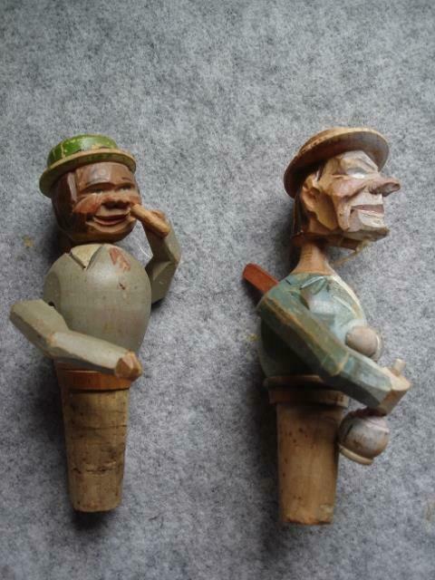 Antique Vintage Mechanical Carved Wood Drinker and Smoker Bottle Stoppers Corks