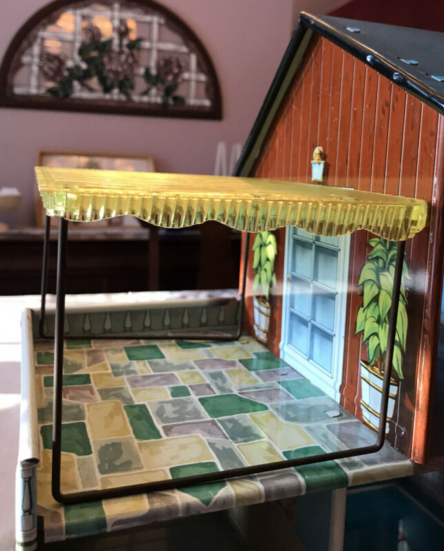 Vintage Tin Litho Metal Dollhouse 2 Story with furniture, Sun Awning and Dolls