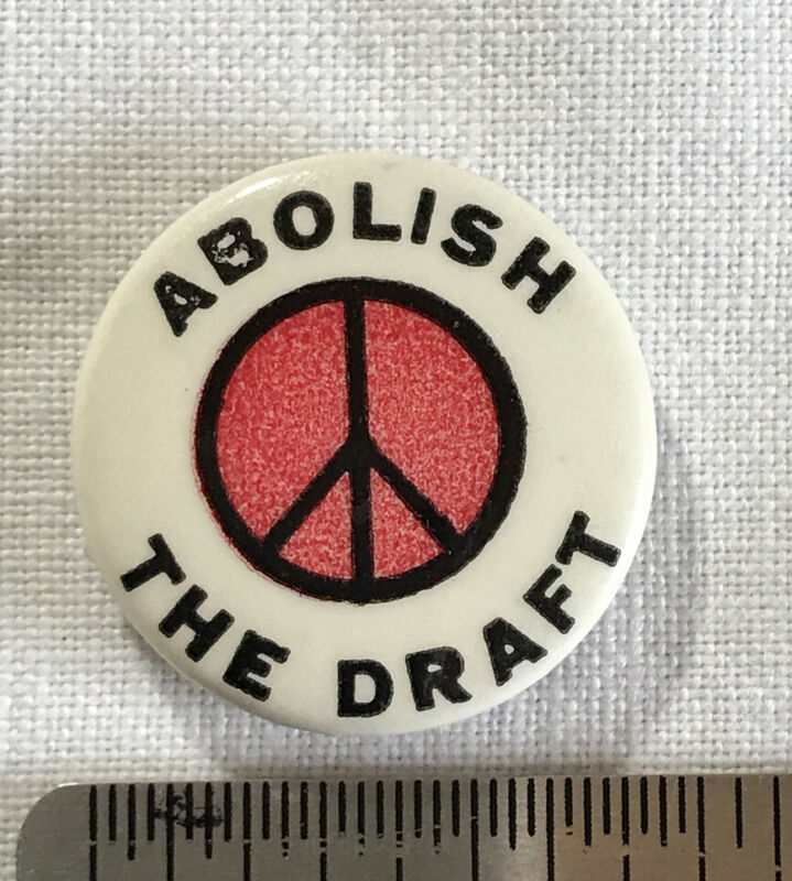 Title (ebay affiliate link): Abolish The Draft with Peace Symbol Anti Vietnam War Cause Pinback Button 1960s