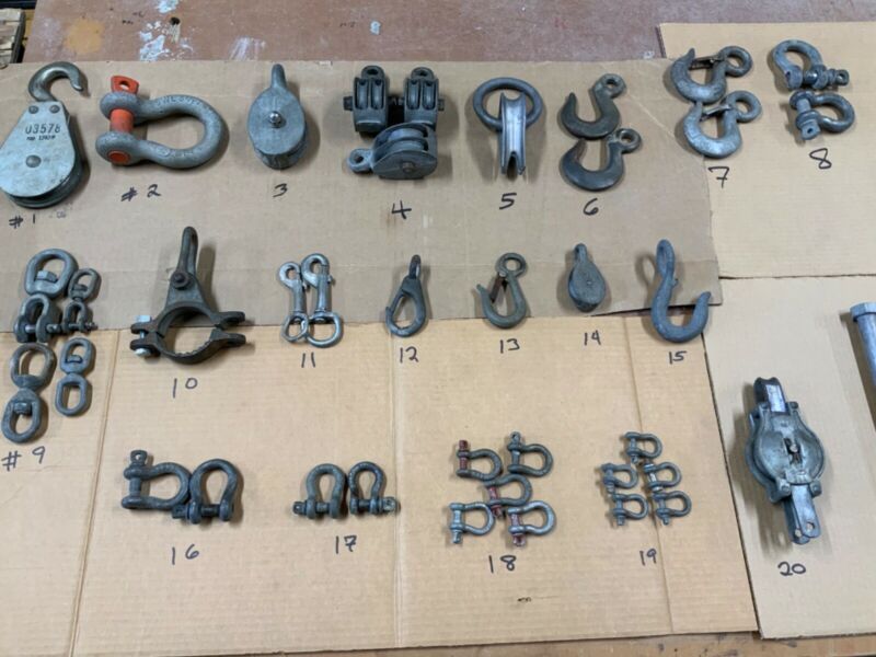 Title (ebay affiliate link): Vintage assorted galvanized pulleys, shackles, clamps, swivels, etc.