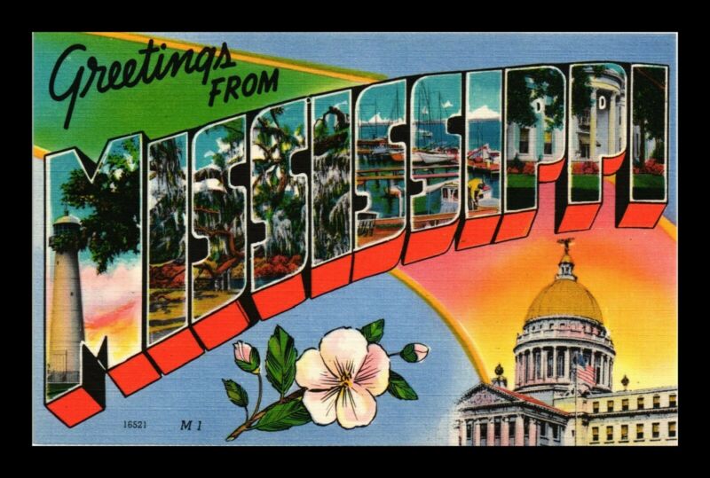 Title (ebay affiliate link): DR JIM STAMPS US GREETINGS FROM MISSISSIPPI BIG LETTERS LINEN TOPICAL POSTCARD