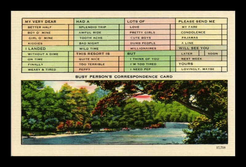 Title (ebay affiliate link): DR JIM STAMPS US RIVER SCENE BUSY PERSONS CORRESPONDENCE CARD LINEN POSTCARD