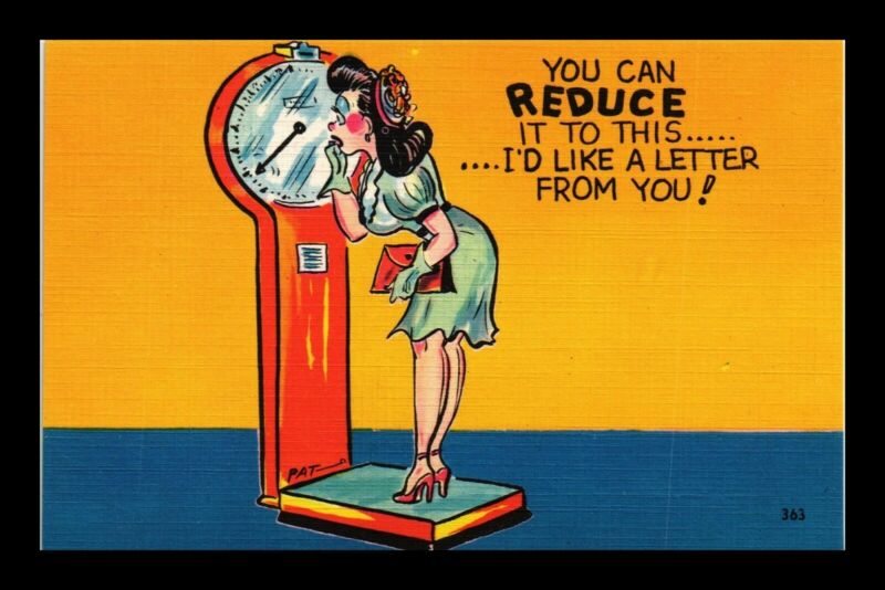 Title (ebay affiliate link): DR JIM STAMPS US WOMAN ON SCALE YOU CAN REDUCE COMIC TOPICAL LINEN POSTCARD