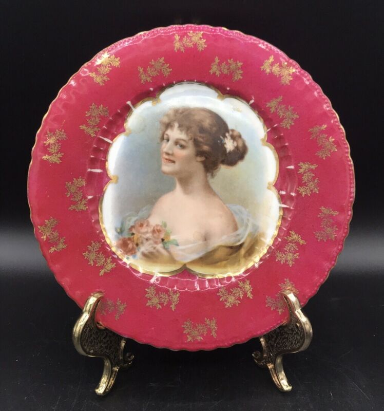 Antique Victoria Austria Porcelain Portrait Smiling Woman Burgundy Gold Plate