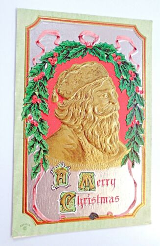SANTA CLAUS ANTIQUE POSTCARD christmas silver & gold printed EMBOSSED HOLLY