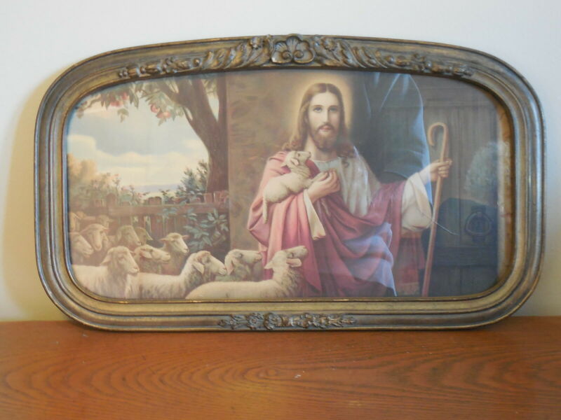 Title (ebay affiliate link): Vintage Gold Wood Frame Print Picture Jesus Good Shepherd 16" x 9" @