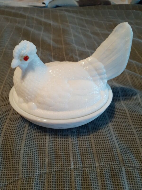 Vintage Milk Glass Large Red/eye Hen Covered Candy Dish