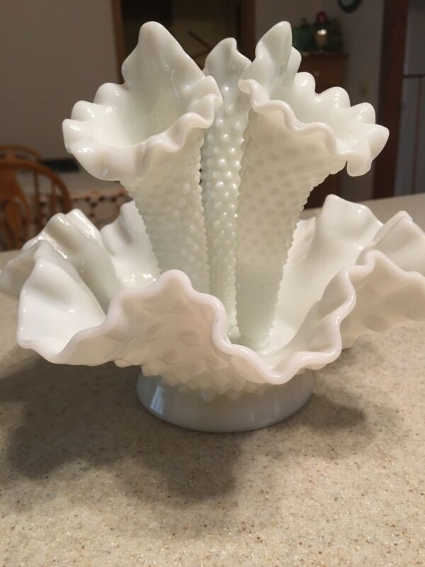 Title (ebay affiliate link): Fenton Hobnail White Milk Glass 3 Horn Trumpet Epergne Centerpiece Vase Bowl