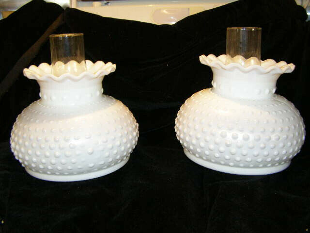 Title (ebay affiliate link): 2 Vintage Hobnail Milkglass Lamp Shades with Clear Hurricanes Shade Fitter 7"