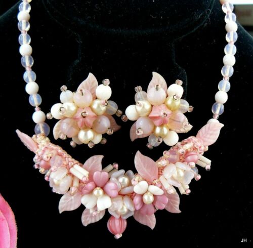 Title (ebay affiliate link): PINK VENETIAN MOLDED MILK GLASS BEAD BIB NECKLACE EARRINGS DEMI PARURE SET ASIS!