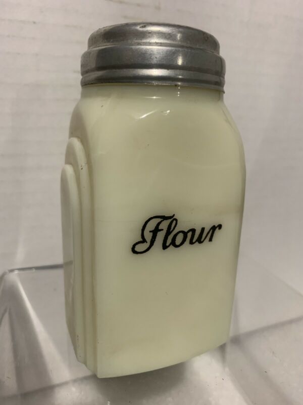 Title (ebay affiliate link): McKee Roman Arch Range Flour Shaker Custard Milk Glass Art Deco Black Letter