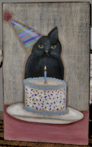 *~*PRIMITIVE*~* HP FOLK ART PRIM BLACK CAT *~* BIRTHDAY CAKE *~* BOARD