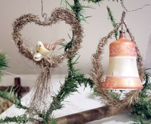 Title (ebay affiliate link): Cotton Bird in Heart Shaped Tinsel. Bell in Tinsel Oval. Two early 1900s German