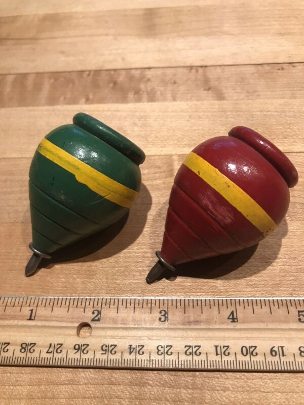 Title (ebay affiliate link): Vintage Red & Green W/ Yellow Stripe Lot of 2 WOODEN SPINNING TOPS Metal Tips