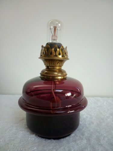 Title (ebay affiliate link): Cranberry Glass Drop In 4" dia Oil Lamp Font. Converted Wright & Butler Burner.