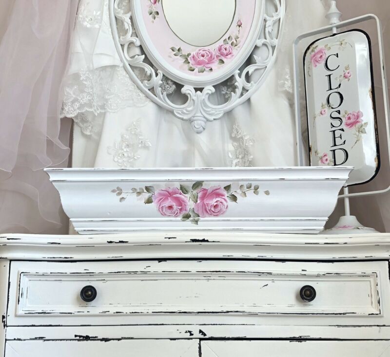 Title (ebay affiliate link): SHABBY CHIC PINK Cottage HP Roses HAND PAINTED White Distressed Floating SHELF