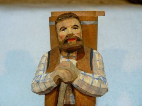 Title (ebay affiliate link): VTG HAND CARVED WOODEN HIKING MAN FIGURINE w/BASKET PLAID SHIRT WALKING STICK