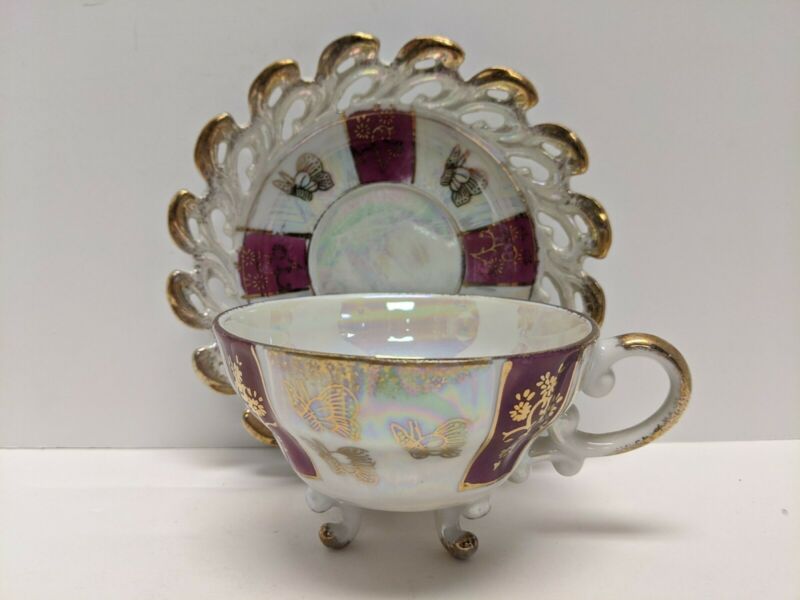 TRI FOOTED TEACUP & SAUCER LUSTERWARE MAROON AND GOLD BUTTERFLIES TEA CUP