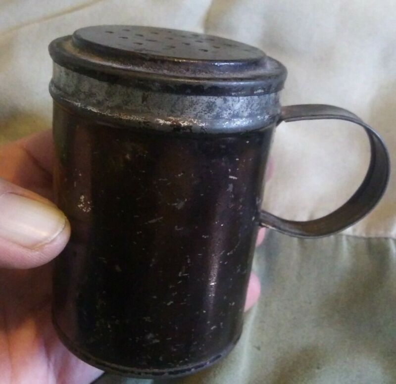 Title (ebay affiliate link): Primitive Antique Japaneed Tin Muffineer Sugar Shaker Strap Handle Kitchenware