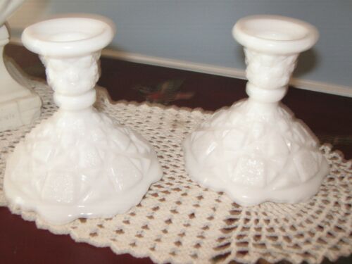 Title (ebay affiliate link): WESTMORELAND OLD QUILT PAIR CANDLE HOLDERS HEAVY MILK GLASS