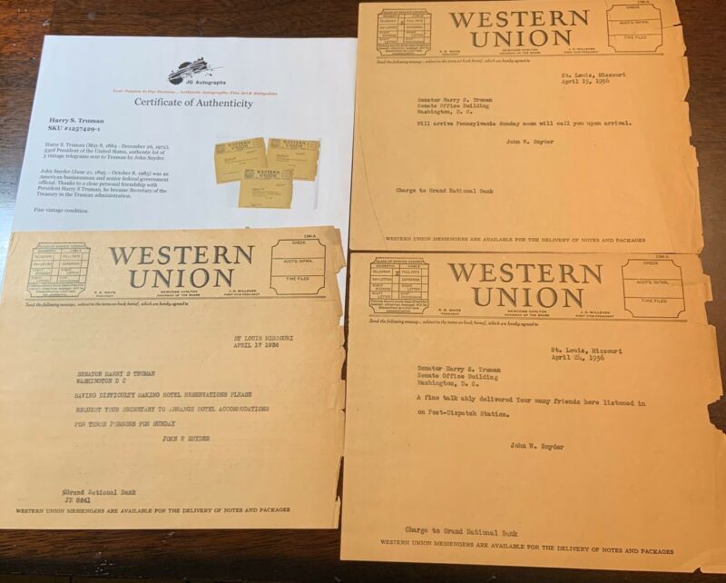 Title (ebay affiliate link): Lot Of 3 Telegrams Sent to Harry Truman From Sec. of Treas. John Snyder 1936 COA