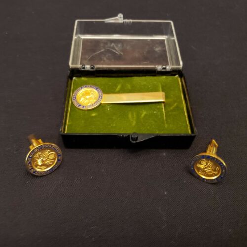 Vintage 3 Pc Set Gold Plated Blue Enamel DEPARTMENT OF STATE Cuff Links Tie Pin