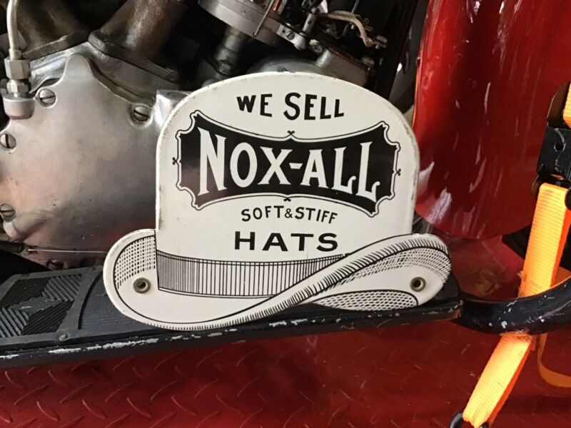 VINTAGE PORCELAIN DIE CUT METAL WE SELL NOX-ALL HATS DOOR SIGN Derby N.Y.C.