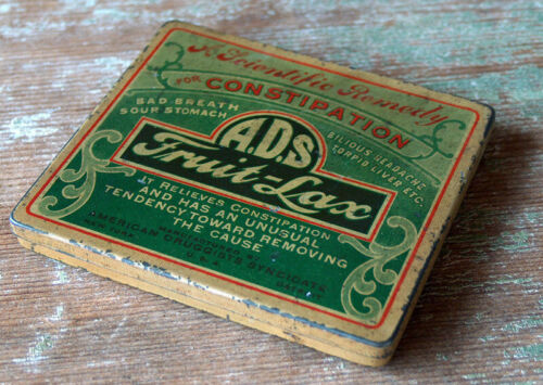 Title (ebay affiliate link): ESTATE Antique ADS FRUIT LAX ADVERTISING QUACK MEDICINE TIN American Druggists
