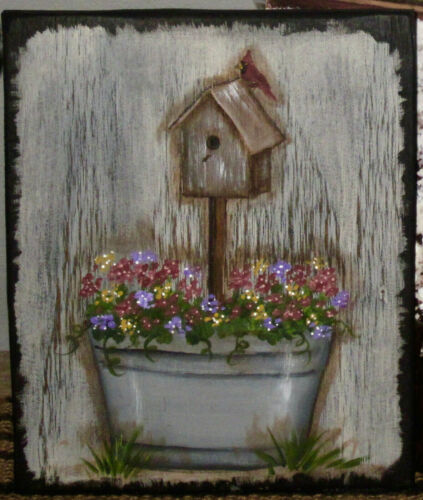 *~*PRIMITIVE*~* HP FOLK ART PRIM TUB OF FLOWERS * BIRDHOUSE * CARDINAL *~* BOARD