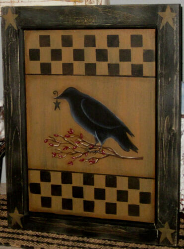 *~*PRIMITIVE*~* HP FOLK ART PRIM CROW *~* PIP BERRIES *~* STAR *~* DOOR PANEL