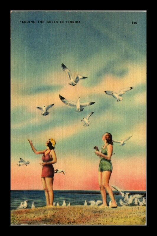 Title (ebay affiliate link): US POSTCARD LINEN WOMEN FEEDING GULLS ON FLORIDA BEACH