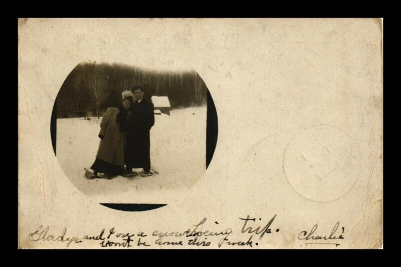 Title (ebay affiliate link): US POSTCARD RPPC MAN IN LONG BLACK COAT STANDING IN SNOW WITH WOMAN