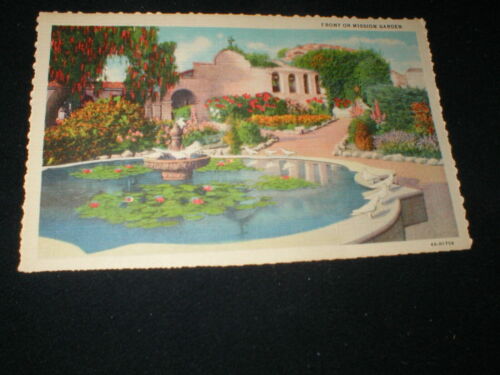 Title (ebay affiliate link): MISSION SAN JUAN CAPISTRANO CALIF -- Mission Garden Lily Pond > Linen Postcard <