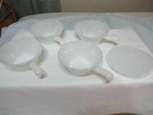 4 FIRE-KING CHILI BOWLS W/HANDLES LID NEW VTG WHITE MILK GLASS ANCHOR HOCKING 28