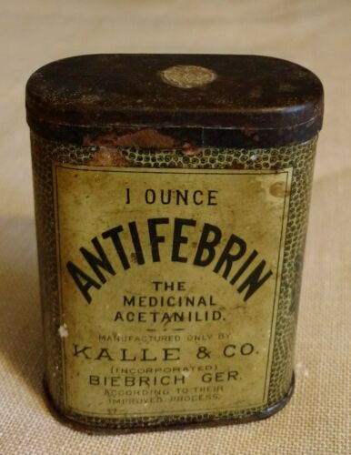 Title (ebay affiliate link): RARE Antique 1 OUNCE ANTIFEBRIN THE MEDICINAL ACETANILID KALLE & CO. Early 1900s