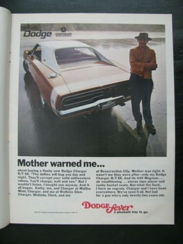 Title (ebay affiliate link): Lot of 2 1969 Dodge Charger Mother Warned Me Rare Male Model Ad Funny & Unique +