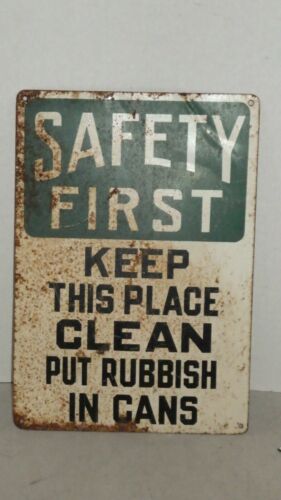 Vintage SAFETY FIRST KEEP THIS PLACE CLEAN Industrial Metal Sign