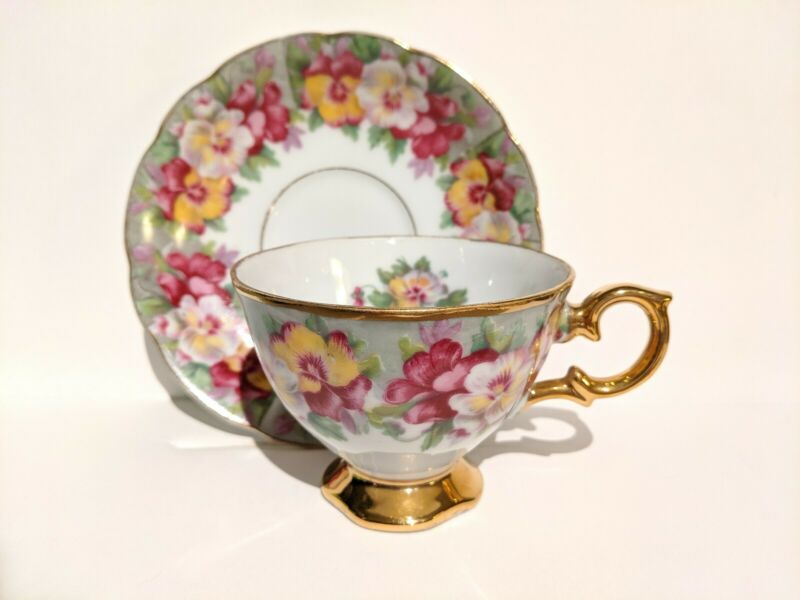 ROYAL SEALY TEA CUP AND SAUCER PANSY GOLD GILT FOOTED JAPAN TEACUP PORCELAIN CUP