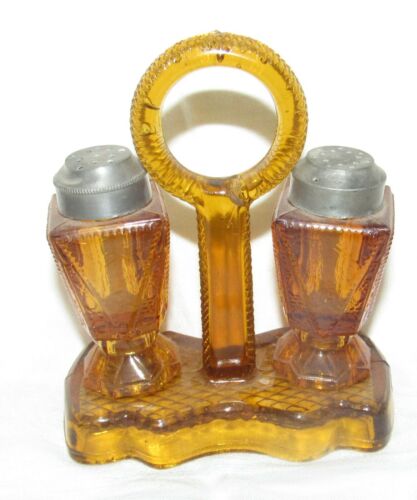 Title (ebay affiliate link): VICTORIAN AMBER GEOMETRIC PATTERN SALT & PEPPER SHAKERS W/ AMBER HOLDER