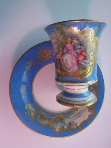 Title (ebay affiliate link): Sevres Hand painted (signed) courting couple & cupid french blue cup saucer