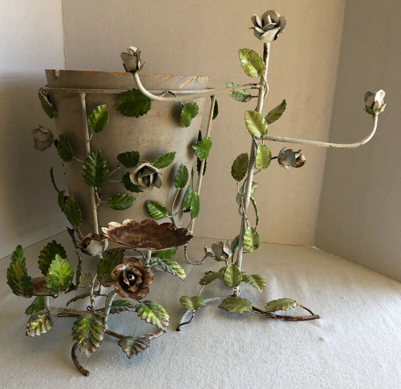 VINTAGE ITALIAN TOLE JEWELRY DISPLAY TOWEL STAND WHITE ROSES 2 Of 3 Pc. SET