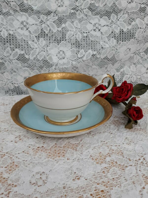 Title (ebay affiliate link): ROYAL GRAFTON BONE CHINA SKY BLUE AND WIDE GOLD BANDS TEA CUP & SAUCER