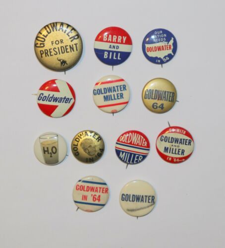 Title (ebay affiliate link): Twelve (12) 1964 BARRY GOLDWATER Presidential Campaign Button Pinback Pins